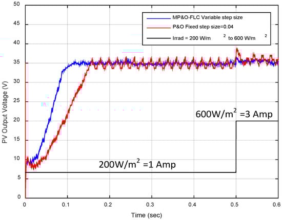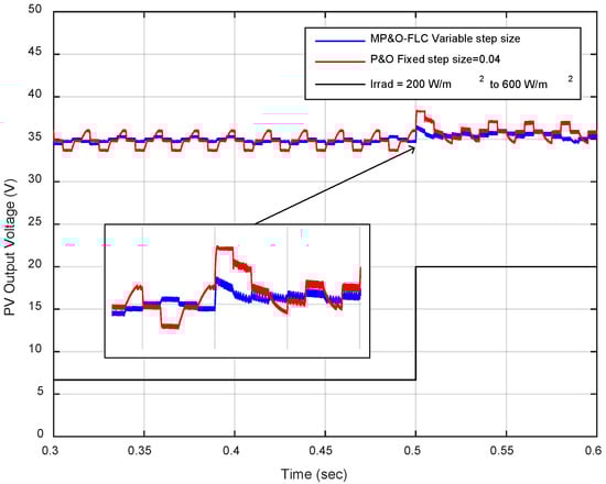 Figure 6 shows the simulated PV output voltage with the fixed step size P&O MPPT and the proposed FLC-based variable step size P&O MPPT. The fixed step size was set at ΔV = 0.04 and a perturbation frequency of 200 Hz (the perturbation period ΔT mppt = 5 ms), with a sudden step change in irradiance from 200 W/m2 to 600 W/m2. The result indicates that the FLC-based variable step size P&O MPPT have a faster dynamic response. The convergence of rising time towards maximum power point gives a settling time of 0.11 s compared with the fixed step size P&O MPPT with a step size of ΔV = 0.04 (scale down value) with a settling time of 0.16 s. It also shows that the proposed MPPT with a variable FLC step size has a lower oscillation of PV output voltage around the maximum power point under steady-state conditions when compared with the fixed step size P&O MPPT which have more oscillations of PV output voltage around the maximum power point under steady-state conditions.