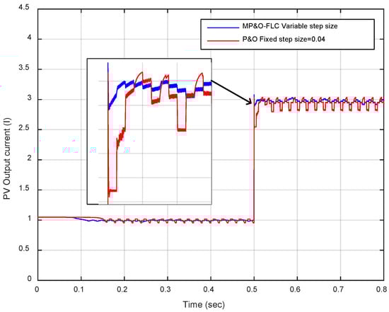 Comparison of PV current with fixed step size P&O MPPT and the proposed FLC-based variable step size P&O MPPT with a step change in solar irradiance.