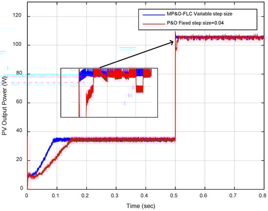 Comparison of PV power with fixed step size P&O MPPT and the proposed FLC-based variable step size P&O MPPT with a step change in solar irradiance.