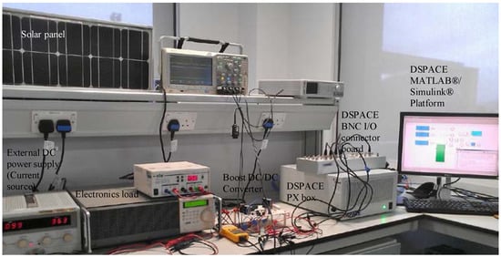The block diagram of the experimental test system for testing MPPT algorithms is shown in Figure 10. It consists of four main parts: the PV source, the boost DC-DC converter, dSPACE-based MPPT and the DC-DC converter controller as well as the electronics load. The experiment set-up is shown in Figure 11.