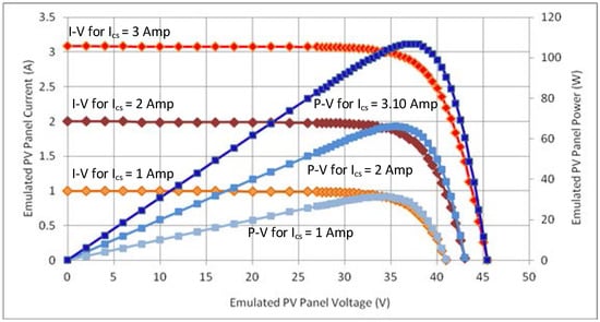 where, ICS represents the external excitement current to emulate the photo-generated current at direct sunlight, I0 represents the dark saturation current, Rs represents the panel series resistance, Rsh represents the panel parallel resistance, Ns is the number of cells connected in series, Vt represents the junction thermal voltage given by equation VT = KTc/q, k is Boltzmann’s constant 1.381 × 10−23 J/K and q represents the elementary charge 1.602 × 10−19 C. The parameters of the solar panel under standard testing condition (STC) are presented in Table 3. STC is an industry-wide standard under which solar panels are tested i.e., by applying the following test coditions (irradiance 1000 W/m2, module temperature 25 °C and an air mass of 1.5 (AM1.5)) [29]. The electrical characteristics of the proposed emulated PV source using different excitement currents is shown in Figure 13.