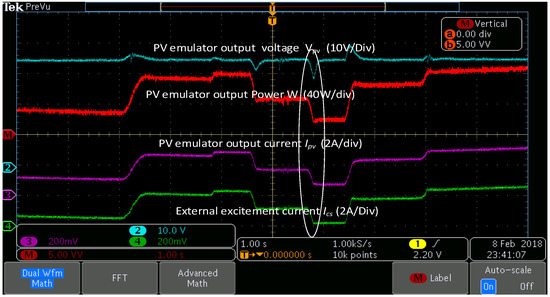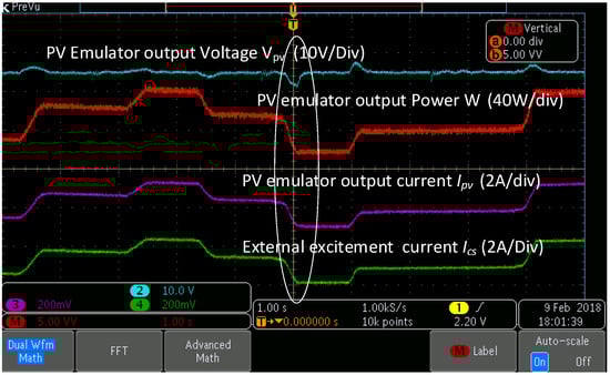Figure 14 shows the proposed P&O-FLC variable step size MPPT algorithm experimental test results with varying external excitement current emulating the variable photo-generated current. The steady-state PV terminal voltage of the emulated PV source is controlled at by the DC-DC boost converter. It observed that with excitement current Ics of 1 Amp (equivalent to 200 W/m2) the PV output voltage is continuously oscillating around the voltage (35.48 V) at the maximum power point.