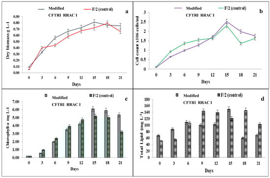 Amphora coffeaeformis RR03 cultivated in the modified CFTRI-RRAC I medium and F/2 control medium at different intervals in 1.0 m2 open raceway pond was subjected to the analysis of (a) dry biomass, (b) cell number, (c) chlorophyll-a, and (d) total lipid content.
