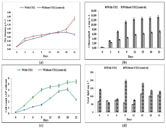 A. coffeaeformis RR03 grown under CO2 supplementation had maximum concentrations of biomass (1.5 ± 0.10 g L−1) and Chlorophyll-a (13.18 mg L−1) on 21st day, as shown in Figure 2a,b. The lipid content of A. coffeaeformis RR03 grown under CO2 supplementation was 114 mg L−1, with 4.03 × 106 cells/mL on 15th day, as shown in Figure 2d. The total cell number and lipid content of the alga in ash-free biomass under with CO2 also increased (Figure 2c,d). Similar trend of lipid productivity of 7.60 ± 0.05 and 21.88 ± 0.15 mg L−1 d−1 was noticed in the presence or absence of CO2, respectively (Table 1). In case of control medium, the alga had a maximum lipid accumulation of 197 mg L−1 with 1.49 × 106 cells/mL on 9th day.