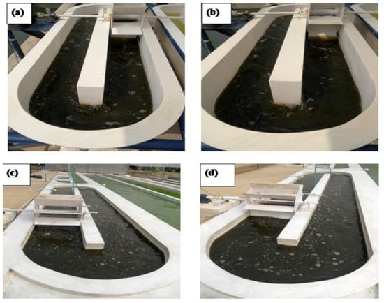 A volume of 1500 L (per batch) withdrawn from the experimental ponds had a biomass concentration from 0.05 to 0.15% dry wt. The culture was treated for ~3.5 to 4.0 h with a flow rate of 600 L h−1 at the voltage (V) and Ampere (A) from 1.8 V and 111 A, and gave a biomass concentration of up to 1.1 to 2.4%. The culture was then pumped to the blending tank and treated with 1 ppm of polyelectrolyte (automated dosing pump). The polyelectrolyte-treated culture was overflowed into a 250 L clarifier, in which the algal flocs settled at the bottom of the clarifier, as shown in Figure 4a. The supernatant was overflowed through the outlet. The biomass recovery efficiency was calculated before and after addition of polyelectrolyte addition up to 79.13 to 94.54%, and 91.62 to 99.57%, respectively.