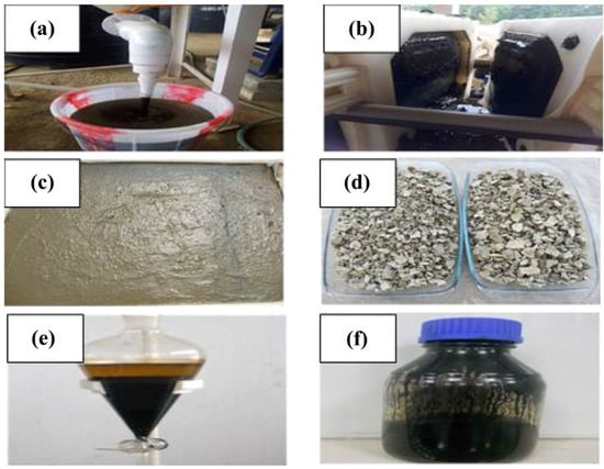 (a) Culture collection of clarifier. (b) Filter press. (c) Fresh biomass under sun dried. (d) Dry biomass. (e) Separated for bio-crude. (f) Bio-crude oil.