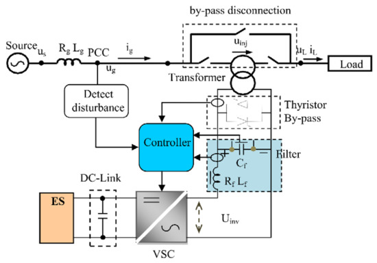 The DVR is a power-electronic-converter-based device capable of protecting sensitive loads from most supply-side disturbances [11]. A DVR is installed in a distribution system between the supply and a sensitive load feeder at the so-called point of common coupling (PCC). Its primary function is to rapidly inject/absorb additional energy in the system in order to avoid any power disruption to that load event of disturbances in the system. The general structure of a DVR consists of a booster transformer, a harmonic filter, a voltage source converter (VSC), and an energy storage (Figure 1).