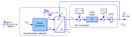Synchronization to the supply voltages is very important in order to control the DVR. It keeps an output signal synchronized with a reference input signal in frequency and phase. Synchronization methods have been developed and presented in many publications [16,17,18]. The most often used synchronization method in engineering applications, the phase-locked loop (PLL) has been used in this paper.