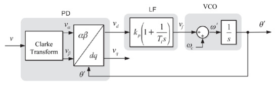 Typically, this block is constituted of a first-order low-pass filter or a PI controller [16]. The output of the PI controller is the inverter output frequency that is integrated to obtain inverter phase angle θ. The PI regulator of the LF will set the angular position of the dq reference frame to make Vd = 0 in the steady state, which means that the PLL will be active when the difference between grid phase angle and inverter phase angle is reduced to zero.