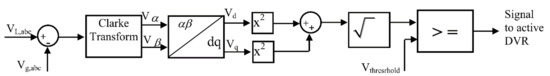 If the voltage dip contains a phase jump, it will lead to a reduction in both the d- and q-components. Details of this case are described in [17]. The structure of the voltage sag/swell detector is shown in Figure 5. The proposed method can detect the change in the state of the supply (start, end points, and phase jump) with low time delay.