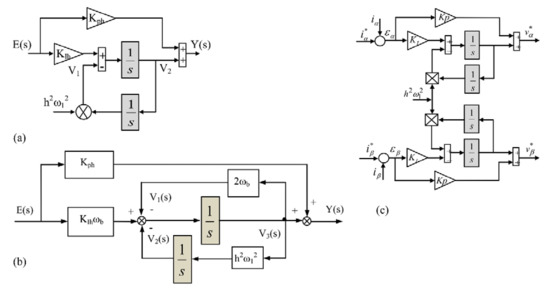 The block diagram of PR controller: (a) ideal controller; (b) non-ideal controller; and (c) controller considering both positive and negative sequence components in the stationary frame.