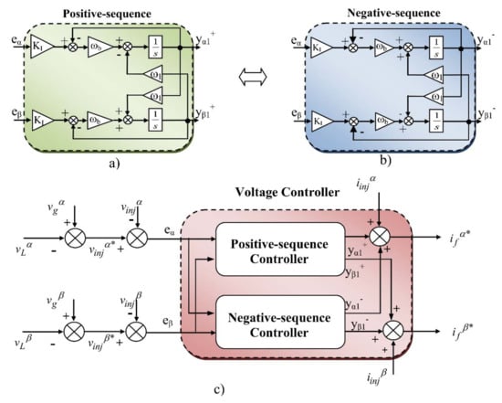 The block diagram of SDR controller for regulating: (a) positive sequence components; (b) negative sequence components; and (c) proposed voltage controller both sequence components in the stationary frame.
