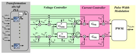 Finally, we propose the new double loop controller designed in stationary frame by combining a PR controller and a SDR controller. The structure diagram of this controller is shown in Figure 8. In this method, the three-phase voltages of the grid are sensed and transformed to two-phase system (αβ) in the stationary reference frame. Then, the positive sequence and the negative sequence components are extracted. Positive sequence grid voltage vector is compared against the positive sequence load voltage command vector. The process of the negative sequence controller is similar. The proposed controller performs in stationary frame so that its structure is simpler than the double-loop controller using the PI controllers in rotating frame which was presented in [8].