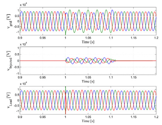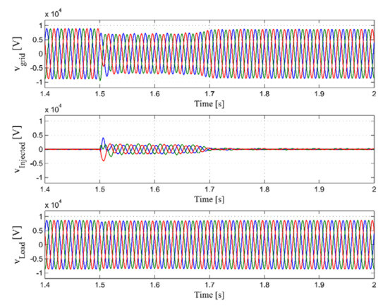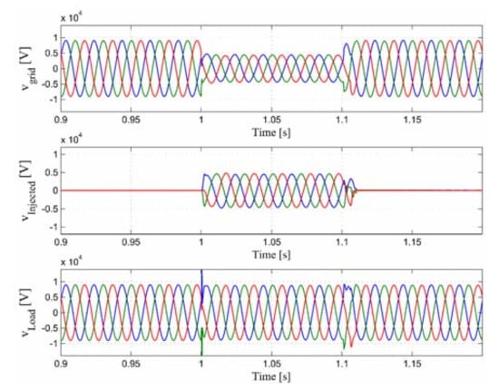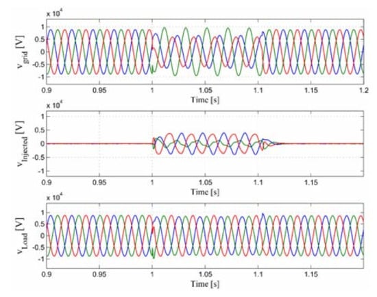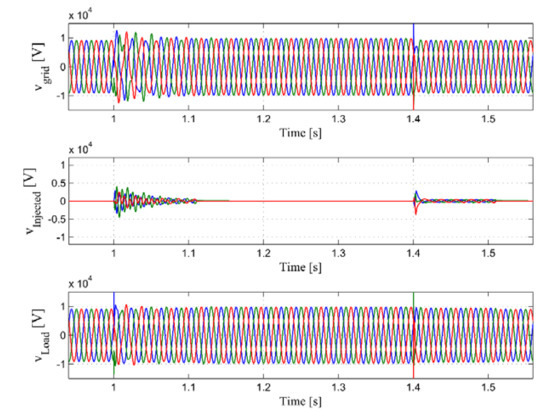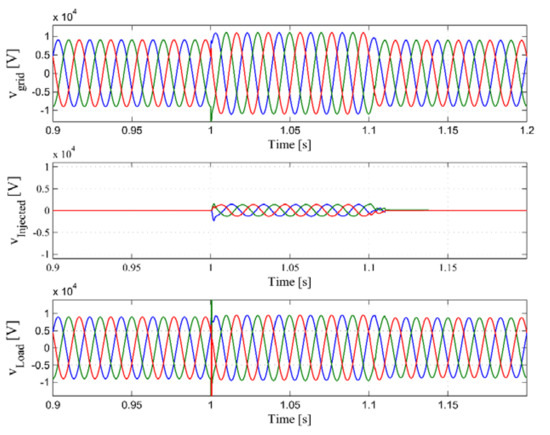 In this case study, from 1.00 s to 1.10 s, a phase to phase short circuit (between phase A and C) occurred in the power system, the voltage at PCC reduced to 35% in phase A, and to 28% in phase C and increased slightly by 10% in phase B respectively to the reference pre-sag voltage and the phase angle jump of grid voltage. The results of this simulation are shown in Figure 11. Observe that the DVR quickly injects the necessary voltage components, with correct both magnitude and phase angle to maintain balanced load voltages. It is shown that the DVR can detect and mitigate the voltage sag in different phases independently and inject the compensation energy through three single-phase transformers to correct the grid voltage.