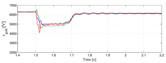 A typical cause of voltage sags is caused by starting a large three-phase motor. The characteristics of voltage sags depend on various factors, such as motor rating, the method of starting and system’s power supply capacity. In this paper, the test system is simulated in the case of starting 1975 kW induction motor. The motor is started at 1.50 s by closing motor starting contactor. The three phase voltage sag RMS waveform of grid voltage is shown in Figure 13. Voltage sag caused by starting motor is unbalanced and drops down to 20% of its nominal value.