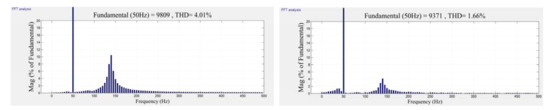 The voltage waveform of grid voltage, injected voltage of the DVR and load voltage are shown in Figure 17. The THD (Total Harmonic Distortion) of the voltage at PCC is 4.01% (measured for 10 cycles’ interval after switching on the capacitor, see Figure 18) and decreased to 1.66% at load side. It can be observed that the load sides voltages are maintained and sinusoidal waveforms are kept almost intact.