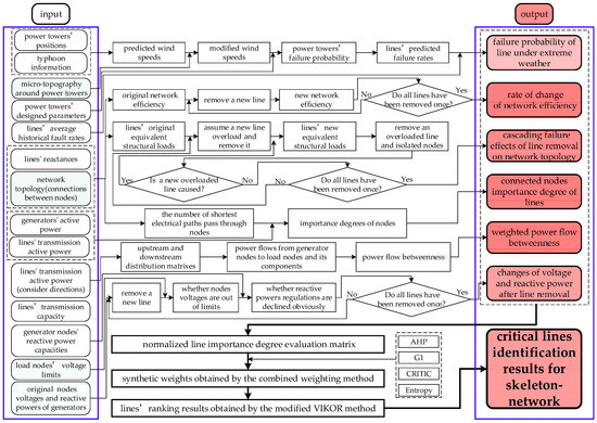 Under this background, it is necessary to identify the critical lines for determining the skeleton-network of the power system concerned. Vulnerability identification method, which is based on the impact of line removal on a given power system, is utilized to identify the critical lines. Several typical vulnerability identification methods have been proposed, including fault chain theory [4], complex network theory [5], risk theory [6] and entropy theory [7]. These methods could be classified into two types. The first type is to identify the critical lines based on the topologic characteristics. In [8], the rate of change of the average network efficiency before and after the disconnection of power elements is proposed to measure the importance degrees of the power elements. In [9,10], an improved maximum flow based on complex network approach for topology analysis is proposed to identify the critical lines in a power system. The other type is to identify the critical lines based on the operation state of power systems. In [11], hybrid flow betweenness index, which covers the power flow’s direction and the line’s maximum transmission capacity, is defined to identify critical lines with a comprehensible physical background. In [12], the power flow index and vulnerability index are defined based on geometry of flow path to analyze the impact of lines fault on a given power system, and then to identify the critical lines. In [13], a vulnerable transmission line identification method is proposed using the improved structural hole theory, converting the critical lines identification in power systems into critical nodes evaluation in correlation networks. In [14], an integrated “betweenness” index is utilized to identify critical lines with the line’s role in the transmission of power flow and the impact of removing lines on power systems considered. In [15], three indexes (i.e., the weighted reactance betweenness index, the relation degree index based on node degree and the status importance index based on active power) considering both operation state and network topology of power systems are proposed for the critical lines identification. Furthermore, the lines with high failure probabilities, which are easy to fail under extreme weather, should also be considered in reinforcement work for the skeleton-network. In [16], a fuzzy inference system based on fuzzy clustering method and a regional weather model are combined to analyze the impacts of adverse weather on the reliability of power elements.