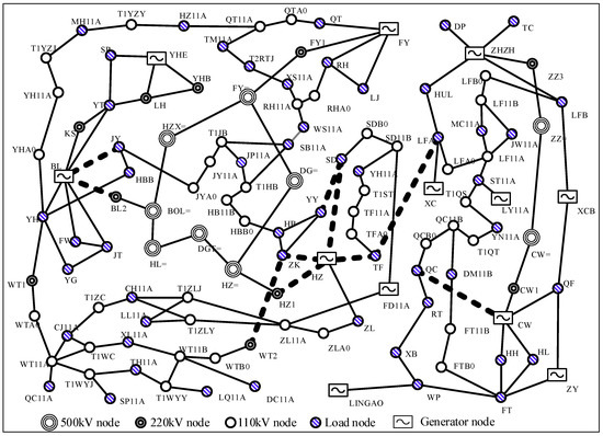 Part of the Guangdong power system in China (Figure 3), including 155 transmission lines and 125 nodes, is utilized to verify the effectiveness of the proposed multi-attribute evaluation method based on the modified VIKOR method (MMVIK) for critical lines identification. In an actual regional power system of China, its subsystems with different voltage levels are regulated by different levels of power grid corporations. The lines with 500 kV voltage level in the power system are managed by the provincial power grid corporation, so these lines are ignored by the regional power grid corporations which are the subsidiaries of the provincial one. The results of critical lines identification are determined by the lines’ importance degree evaluation results and the actual demands of power grid corporations. In this paper, the top ten lines obtained by using the MMVIK method are identified as critical lines for easy demonstration. It is assumed that , vT = 5.6 m/s, vmin = 35 m/s, , Kλ = 0.1, αcid = 0.5, = 0.8, and [19].