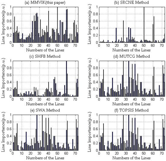 To further demonstrate the effectiveness of the MMVIK method for critical lines identification, five methods, i.e., single-attribute evaluation method based on the rate of change of network efficient (SRCNE) [8], single-attribute evaluation method based on hybrid flow betweenness (SHFB) [11], multi-attribute evaluation method based on utility theory and cooperative game (MUTCG) [15], SWA [28] and TOPSIS [29], are employed for comparisons. The final line importance evaluation results and the top ten lines of the actual regional Guangdong power system obtained by the six methods are shown in Figure 4 and Table 6, respectively.