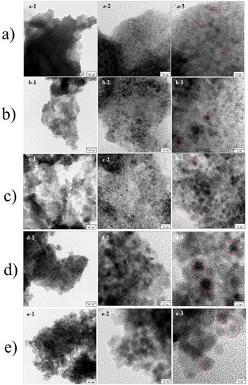 Transmission electron microscopy (TEM) images of (a) sample #1; (b) sample #2; (c) sample #3; (d) sample #4; and (e) sample #5. The crystalline sizes of the Fe3O4 nanoparticles (NPs) are shown within the dotted red circles.