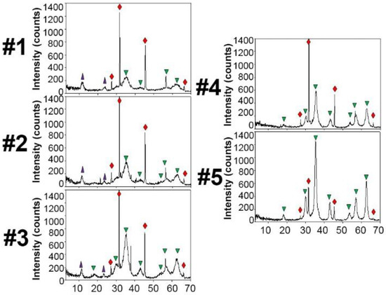 Powder X-ray diffraction (PXRD) patterns of samples #1–5.