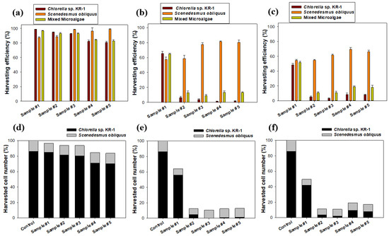 Microalgae-harvesting efficiencies (%, top) of respective Chlorella sp. KR-1, Scenedesmus obliquus and mixed microalgae (Chlorella sp. KR-1 and Scenedesmus obliquus were mixed in a 1:1 ratio by volume) by samples #1 - #5 at pH 4.0 (a); pH 7.0 (b); and pH 10.0 (c) and corresponding proportions (%, bottom) of respective Chlorella sp. KR-1 and Scenedesmus obliquus in mixed microalgae by samples #1–#5 at pH 4.0 (d); pH 7.0 (e); and pH 10.0 (f). Control is proportions of Chlorella sp. KR-1 and Scenedesmus obliquus in initial media.