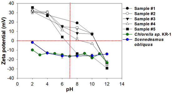 Zeta potentials of samples #1–5, Chlorella sp. KR-1 and Scenedesmus obliquus according to pH.