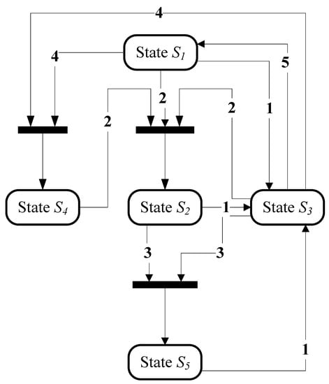 The EMS is implemented using a finite state machine approach. This tool is widely used in decision making algorithms and EMSs []. A state machine makes a transition between modes (states) according to specific events. In each state, the power references for the local controllers are defined. The algorithm implemented can be represented by a statechart, which is a graphical way to describe a finite state machine, as shown in Figure 2.