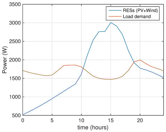 A complete model of the system was implemented in MATLAB/Simulink according to the description of the models of Section 2. The system specifications, levels, the constant battery charging power, as well as maximum power adopted are shown in Table 6. The profiles corresponding to the generation from RESs and the load demand shown in Figure 4 are used to carry out the simulation of the EMS performance.