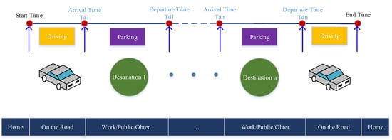 Due to the mobility of PEVs and users’ travel habits, the charging behavior of PEVs is full of randomness. To obtain the spatial and temporal distribution of PEVs, the concept of the trip chain is introduced here to analyze users’ travel behavior []. According to national household trip survey (NHTS) data [], the trip destinations of PEVs can be classified into four types: Home (H), Work (W), Public leisure (P) and Other transactions (O). The typical daily movement of PEVs based on trip chain is shown in Figure 1.