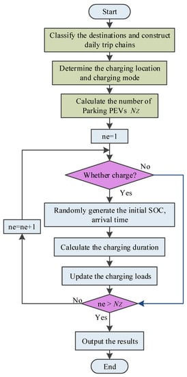 On this basis, the spatial-temporal load model of PEVs that can be directly applied in the coordinated charging procedure is established, and the flow chart is shown in Figure 2.