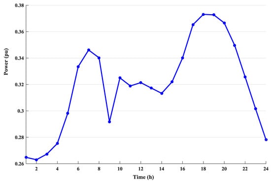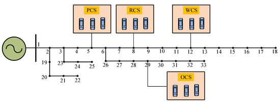 In this paper, the IEEE 33 distribution system is used to demonstrate the proposed model and method. The system structure diagram is shown in Figure 4. The PCS, RCS, WCS and OCS are located at node 5, 8, 12 and 29, respectively. For each node of the IEEE 33 system, the load data is from the measured data of a real-urban area in China []. In addition, the typical daily load curve is shown in Figure 5. For all kinds of charging stations, SOCs obeys the normal distribution N (0.5, 0.1), SOCf is set as 1, and the relevant parameters of the PEVs [] and the PSO [,] algorithm are shown in Table 3. For better comparison, five different cases are described as follows: