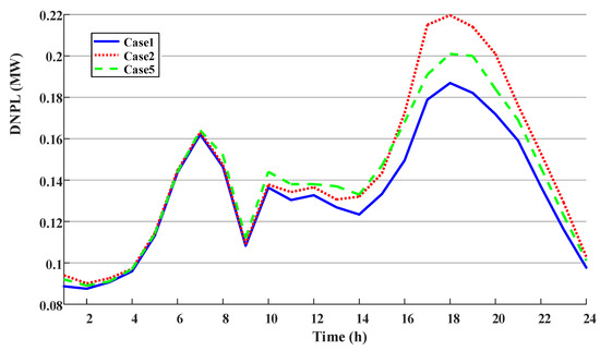 The simulation results of DNPL and MVD in different cases are shown in Table 8. From Table 8, it is observed that compared with case 1, the DNPL and MVD in case 2 are both greatly increased with uncoordinated PEVs connected to the distribution network. To mitigate these negative impacts, the coordinated charging strategy is adopted in case 3–case 5. In case 3, the DNPL is maximally reduced to 3.358 MW, and in case 4, the MVD is maximally reduced to 0.3136 pu. In case 5, both the DNPL and MVD are taken as the objective functions with a weight ratio of 3:1. Compared with case 2, the DNPL is reduced to 3.372 MW and the MVD is reduced by 10.5%, which achieves satisfactory result of both DNPL and MVD.