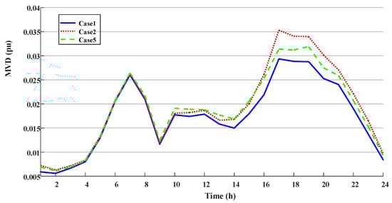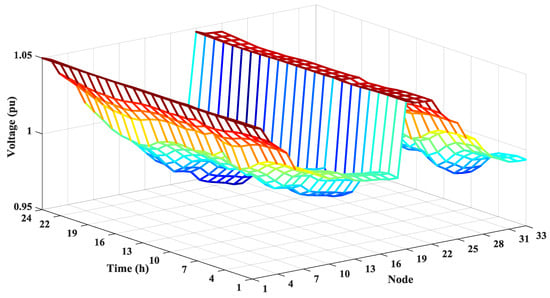 From the distribution network operator, the voltage deviation partly represents the power quality concern, which is essential to the safe operation of the distribution network []. It is important to avoid large voltage deviations. The expression of MVD is as follows: