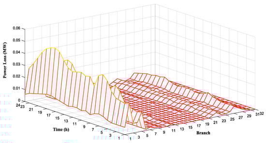 Figure 7 and Figure 8 show the daily power loss and maximal voltage deviation, it can be found that during the peak period of load demand, both the power loss and maximal voltage deviation reach the maximum value, which increases the operation risk. From Figure 9, it can be observed that the power loss of every branch in the distribution network is very small after optimization, which avoids obvious economic loss. Figure 10 shows the node voltage of the distribution network in case 5. In Figure 10, the voltage of each node at each moment is between 0.95 pu and 1.05 pu, which validates the effectiveness of the coordinated charging strategy in voltage profile improvement.