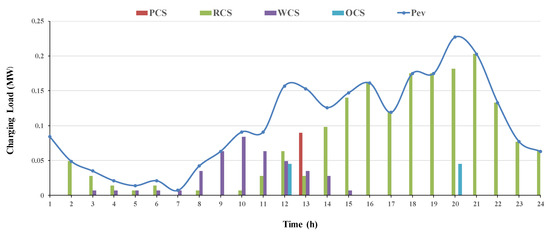 The optimal charging load of PEVs in different locations has large differences, as shown in Figure 11. The charging load in RCS is the highest and the peak load occurs from 18:00 to 21:00. This is because most residents are used to charging at home after the last trip. The charging behavior in WCS mostly occurs in 8:00–14:00 and the charging load is smaller than only RCS. The charging load in PCS and OCS is relatively small, which is because once PEVs are fully charged in RCS or WCS, it is enough for the users to finish daily trips. Through the optimal charging, the number of PEVs are properly assigned to different charging stations, which avoids the large-scale concentrated charging at rush hour.