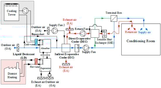 LD-IDECOAS uses fresh, 100% outdoor air, without any return air from the room. The air is supplied to the conditioning room through the LD and evaporative cooling sections of the system (Figure 1). In the construction of the proposed system, the outdoor air is first dehumidified by the LD unit. Subsequently, the processed air passes through the installed evaporative cooling unit, IEC, and direct evaporative cooler (DEC) and is subjected to sensible cooling to meet the supply air set point. The LD system consists of a regenerator, a dehumidifier, a sensible heat exchanger (SHE), a heating coil (HC) for heating the weak solution and a cooling coil (CC) for cooling the strong solution. As the processed air passes through the dehumidifying part of the LD, the strong solution that is injected into the dehumidifying part removes the moisture from the air. After the dehumidification process, the weakened solution in the dehumidifier enters the regeneration section and reverts to a strong solution through the water evaporation process. During the evaporation process, the vapor pressure must be high and the weak solution first enters the SHE. It is first heated and then reheated by the HC. The HC and the SHE are located in the exhaust side of the system so that exhaust air can be sent to the secondary channel of the IEC. When the evaporative cooling system provides sensible cooling, on the secondary side of the IEC, the lower side of the WBT is selected from the outside air, and the exhaust air to be sent to the secondary channel and a better cooling effect can be attained by cooling the processed air that passes through the primary side. Depending on the thermal load required for the air-conditioning space, the flow rate of air supplied to the room fluctuates. The advantage is similar to the VAV system. The path highlighted in blue in Figure 1 is the path through which the cooler supplies air to the air-conditioning space. Additionally, the area marked in red indicates the path of the indoor return air and the exhaust air.
