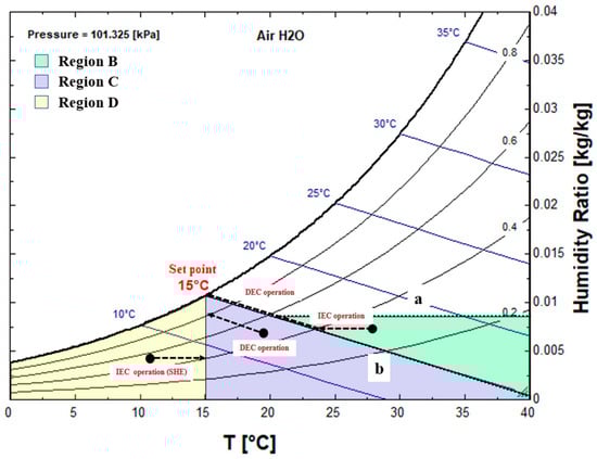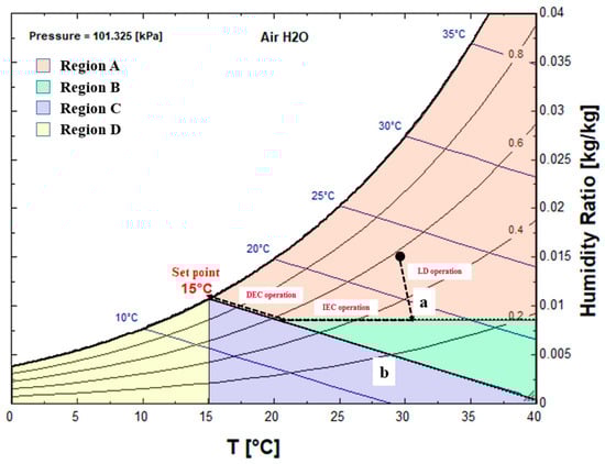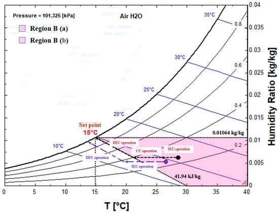 There are two possible situations when ambient air is in Mode B (Figure 6). If it is located in region B, the IEC will operate first. At this time, there are two cases. In the case of situation a in region B, the set point enthalpy cannot be reached even after IEC is applied, and CC works to handle the latent load in the air. After CC is cooled to the set point enthalpy, the cooling process is executed along the enthalpy line to maintain the set DEC temperature. If the IEC has been sufficiently cooled to reach the enthalpy line of the set point or has cooled more than the set point enthalpy, DEC is immediately used to achieve cooling to the set point temperature.
