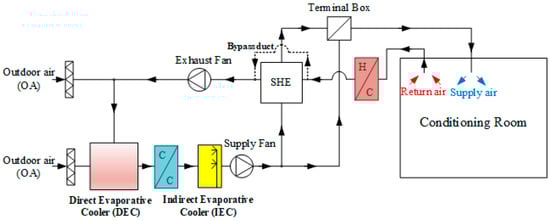 Figure 4 depicts the IDECOAS proposed in this study. The proposed IDECOAS consists of the IEC, CC, and DEC. The HC and SHE were installed as the exhaust side configuration of the proposed LD-IDEOCAS. In the path of the outside air, the primary channel of the IEC passes first, followed by the CC and DEC. The flow rate of the SA is the same as that of the conventional VAV system, similar to the case of the proposed LD-IDECOAS and it fluctuates according to the heat load of the building space.