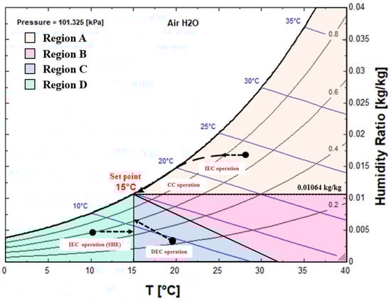 Regions B and C, which are listed under the outdoor air conditions, describe the intermediate season. At this time, the outside air is higher than the set temperature, the air is sufficiently dry, and the operation of CC is determined according to the degree of humidity of the outside air. If the enthalpy of the outdoor air is higher than the enthalpy of the set point, it is placed in the B region, and the CC works to handle the latent heat load in the processed air. Additionally, DEC then performs a cooling process along the enthalpy line to maintain the set temperature. Conversely, if the enthalpy is lower than the set enthalpy, it enters region C, whereby only the DEC operates and adiabatic cooling occurs.