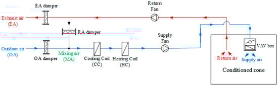 In order to compare the energy performance with LD-IDECOAS, a VAV system with a reheating coil (RHC) was used to prevent overcooling problems in the cooling section of the CC (Figure 7). The economizer on the air side was used in this simulation. The cooling process of the air-conditioning space was mainly carried out by CC. On the cooling coil side, a water-cooled chiller was applied and was operated to maintain the supply air temperature (that is, 15 °C saturated). If the temperature of the processed air was lower than the set point temperature after CC, the RHC starts to operate. In the summer, when the undesired overcooling occurs owing to the operation of the cooling coil, the RHC is operated to raise the temperature of the processed air. When it is extremely hot and humid, not only is the required cooling load increased, but the energy consumption is also increased at the heating side, and the energy consumption of the entire system is increased. The supply air flow of the VAV is basically changed according to the heat load of the room and the minimum ventilation requirement is determined according to the information provided in the ASHRAE standard 62.1-2013 [22].