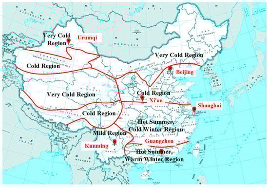 Because of its vast land area of 9.6 million square kilometers, China has a very complex terrain and a diverse and distinct climate. Owing to the complexity of the terrain, China has created a very diverse and distinct climate. China’s climate classification is largely divided into five major climatic zones for thermal environmental design according to the GB50176-93 “Thermal Design Code for Civil Building standards” [23]. The monthly average temperatures of the hottest month and coldest month in each region were the criteria for dividing the entire country into different regions. As shown in Figure 8, these regions include the severe cold, mild, hot summer, cold winter, hot summer, warm winter regions, and the very cold regions. In this study, the cities were located in six different climatic zones and were selected for simulations of the energy performance of the proposed system in regions with different outdoor conditions, as shown in Figure 8.