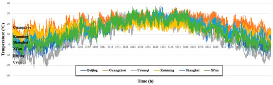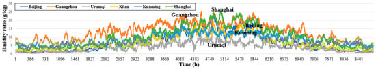 As a representative city for each climate area, there is a significant difference in outdoor conditions, as shown in Figure 9 and Figure 10, which indicate the changes in the annual outdoor conditions of each city. Beijing, Urumqi, Kunming, and Xi’an, all belong to relatively dry climate regions, while Guangzhou and Shanghai are classified as humid regions. In addition, Urumqi has lengthy winter climate features and Guangzhou’s annual temperature difference is very low and it has a very warm climate in winter. The meteorological data of the six selected regions were exported by the TMY2 weather data provided in TRNSYS 17 [24] and the thermal load of buildings, outdoor air (OA) conditions, and return air conditions were applied to the simulation to calculate the air flow in each region.