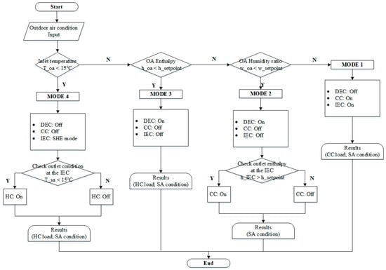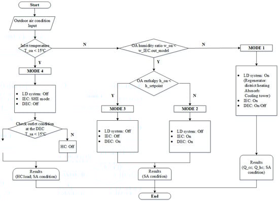 In the proposed IDECOAS, similar to the LD-IDECOAS proposed above, the operation is divided into four operation modes. Depending on the outdoor air conditions, the operation mode is selected and the system is operated according to the selected mode, as shown in the psychrometric chart of Figure 5.