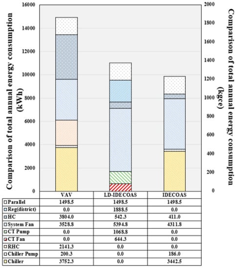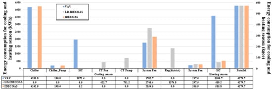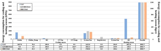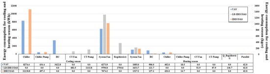Figure 13 shows a comparison of energy consumption when three systems are applied in the Beijing region. In the summer, the VAV and IDECOAS systems are both subjected to load handling by the cooling coil, while in Beijing, IDECOAS consumes more energy than the conventional VAV system. The energy change of the cooling coil part in the IDECOAS is mainly due to the pre-cooling effect of the IEC. If the IEC efficiency is high, the cooling coil consumption in the IDECOAS is reduced and if the IEC efficiency is low, the cooling coil is used extensively. In this simulation, the IEC efficiency was set to 80%, but the IEC efficiency did not reach 80% during the operation of the actual system. In the summer in the Beijing region, the cooler consumption is high owing to the slightly hot and humid conditions, and the limited cooling performance of the IEC. However, the proposed system consumed more fan energy owing to the introduction of LD. The energy-saving system, such as the CT and district heating, was applied in the proposed system, and the energy used for the fan part was thus complemented by this. As a result, in the summer in the Beijing region, the proposed system yielded an energy saving of approximately 35.25% compared to the VAV system and can save an additional energy of approximately 20.44% compared to IDECOAS. In the winter, it consumes 38.19% less energy than the conventional VAV system.
