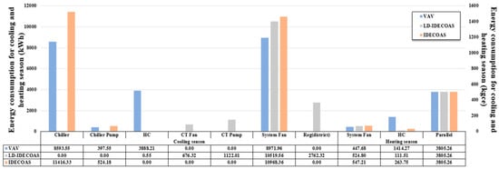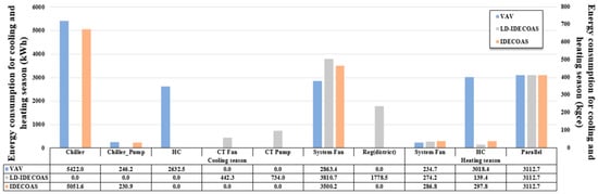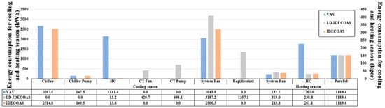 The seasonal energy consumed in Xi’an, as shown in Figure 15, is similar to that consumed in the Beijing region, and because of the precooling of the IEC part of IDECOAS, the energy consumed in the cooler section is slightly lower than that of the VAV. Here too, the proposed system consumes more energy in the fan section owing to the system configuration, but this can be offset by the thermal energy consumption in the proposed system. In terms of the total energy consumption, the proposed system saves approximately 39.4% of the energy consumed by the VAV system, and approximately 22.96% less energy compared to IDECOAS.