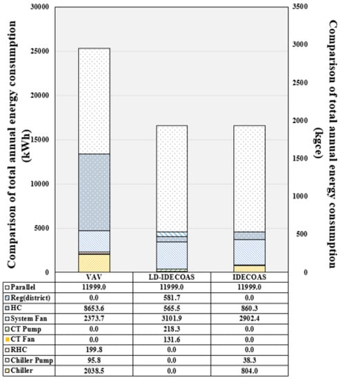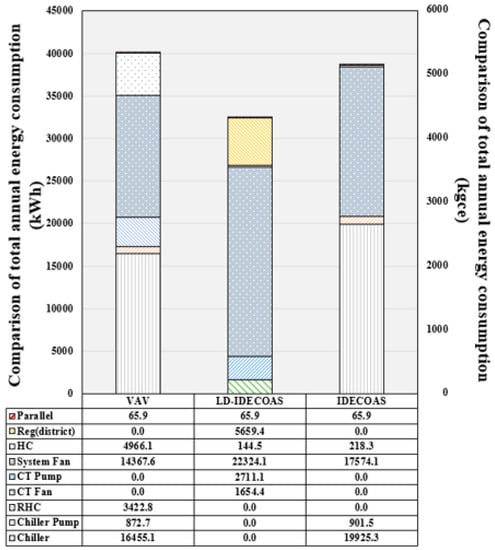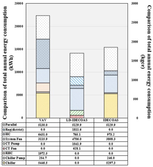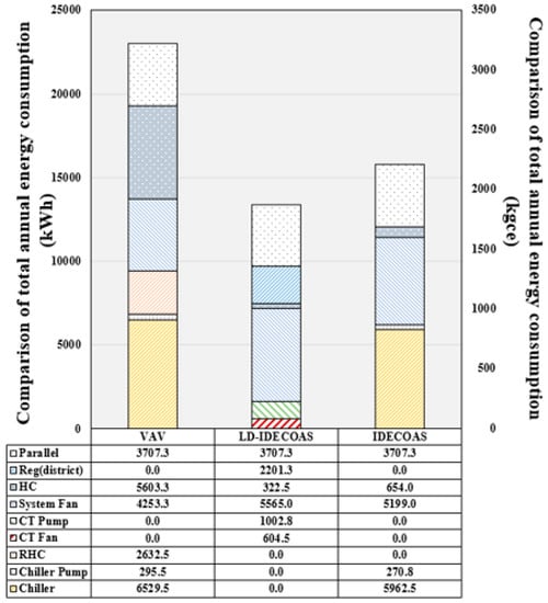 Shown in Figure 23 is the total annual energy consumption of each system in the Guangzhou area. Guangzhou can yield energy savings in reference to the LD part owing to the hot and humid weather condition throughout the year. Correspondingly, the LD part is used more and the fan usage is also increased. Therefore, although the advantages of the proposed system are better than those of the other systems, the usage of the proposed system is also high. The final annual data analysis shows that the energy saving is approximately 18.91% compared to VAV and that the energy consumption is approximately 15.83% less than IDECOAS.