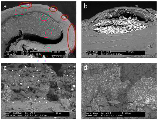 Looking at the ultimate analyses, it is possible to state that the more severe the process conditions, the more oxygen is lost, while the carbon content increases in the solid phase. In particular, both grape seeds and skins loose from 12% to 54% of oxygen, depending on both process temperature and residence time. Interestingly, the reduction in ash content is stronger in skins than in seeds: this can be explained considering that while skins are mainly composed by hemicellulose and cellulose, seeds have higher lignin content, which is more resistant to HTC conversion. Moreover, as it can be seen in Figure 1a,b, minerals are embedded within the seeds and close to the surface, highlighted by the red circles. Ashes can then be solved in water only when water comes in contact with them, by entering the seeds. This happens at more severe conditions. As far as skins are concerned, minerals are more easily accessible, since they are not strictly embedded within the woody matrix. Figure 1c,d show both skins and seeds after the HTC treatment. Interestingly, minerals are attached to the surface and this can be explained by the fact that during the process water coats the biomass and, when drying the hydrochar, minerals deposit on the surface. Thus, in the case of seeds, less ash dissolves into the liquid phase because the ash remains more closely linked to the seed lignin structure than in the case of skins. However, in order to have a more comprehensive explanation on the behavior of ash during a HTC process, more in deep analyses are required.
