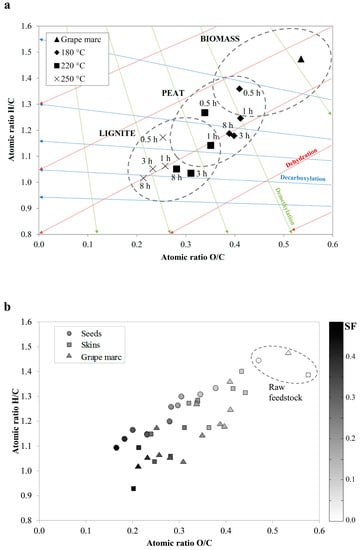 Figure 2a shows the van Krevelen diagram [32] obtained from the data relevant to grape marc. In the van Krevelen diagram, the influence of both temperature and residence time is evident. These process parameters influence both dehydration and decarboxylation reactions, promoting the loss of water and carbon dioxide during the process. An interesting information that can be recovered from Figure 2a is that temperature seems to linearly increase the loss of hydrogen and oxygen atoms. Considering constant the residence time, the three points (obtained at 180, 220 and 250 °C) can be arranged in straight lines (dehydration lines), with positive intercept. Actually, the point obtained at 3 h and 250 °C does not respect the general trend: it is positioned in a higher position in respect to the expectations. When considering that re-polymerization reactions can occur at longer reaction times rather than at higher temperatures and that re-polymerization of cyclic or long-chains molecules may slightly increase the hydrogen atomic ratio, this might explain the position of the point corresponding to 3 h at 250 °C.
