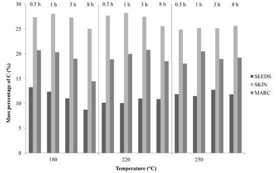 As far as grape skins and marc are concerned, the carbon mass fraction tends to decrease with time, and this behavior can be appreciated for each HTC temperature. Considering HTC of grape skins, the carbon content ranges between 67.9% (8 h, 250 °C) and 85.4% (1 h, 180 °C) in the hydrochar, between 24.9% (0.5 h, 250 °C) and 28.2% (1 h, 220 °C) in the liquid, and between 1.4% (8 h, 180 °C) and 5.6% (8 h, 250 °C) in the gas. As far as grape marc is concerned, the carbon ranges between 69.1% (8 h, 250 °C) and 85.7% (0.5 h, 220 °C) in the hydrochar, between 14.4% (8 h, 180 °C) and 20.8% (3 h, 220 °C) in the liquid and between 1.0% (0.5 h, 180 °C) and 4.6% (8 h, 250 °C) in the gas.